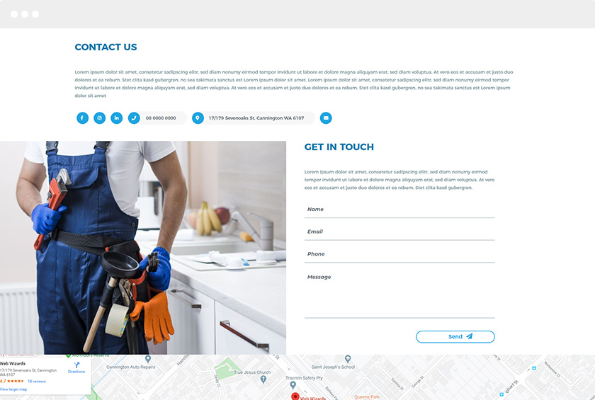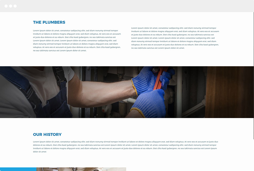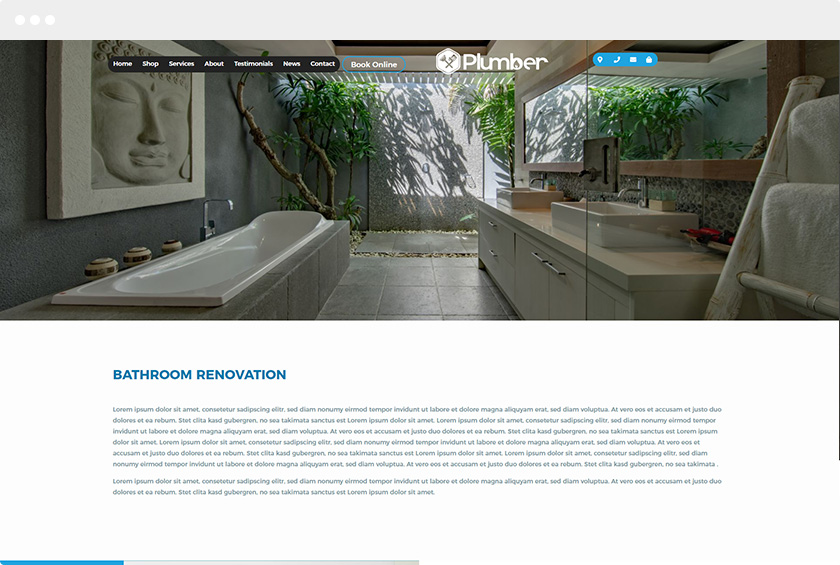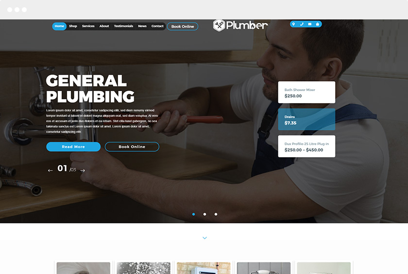 A very adaptable design with bold and large image spaces to attract attention. The design doesn’t need to be limited to Tradies and would work effectively for Retail online. The lines are clean, drawing focus to either your services or products with content boxes on the home page to highlight them. There are duplicated ‘Call To Action’ buttons to encourage people to book, call or buy now.